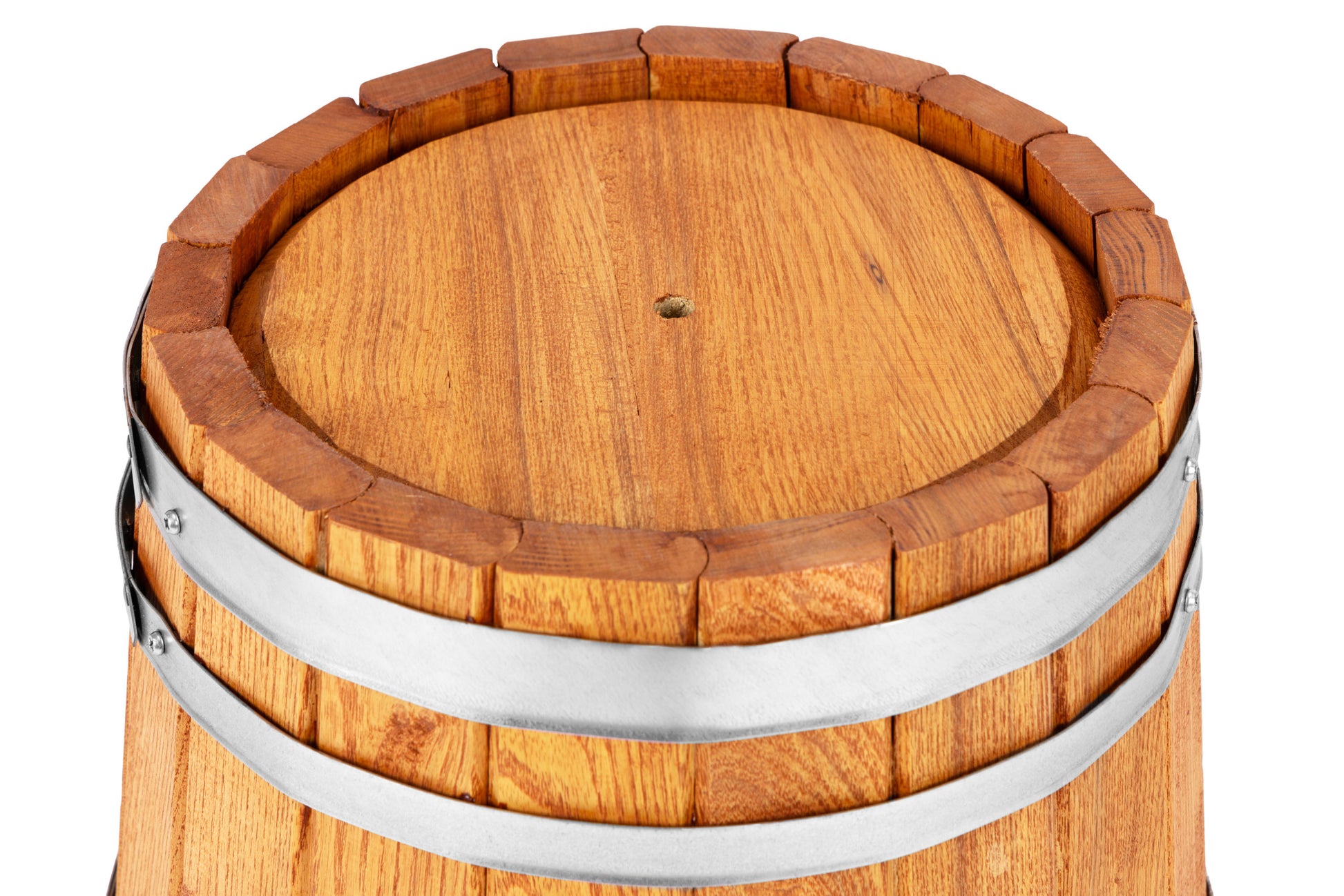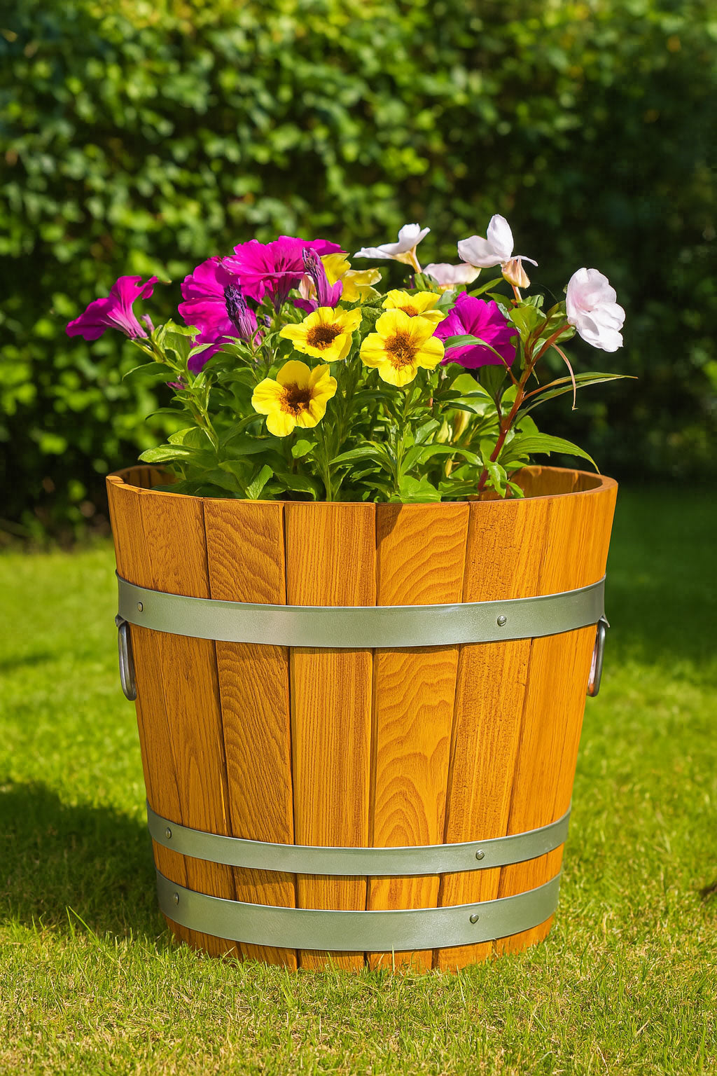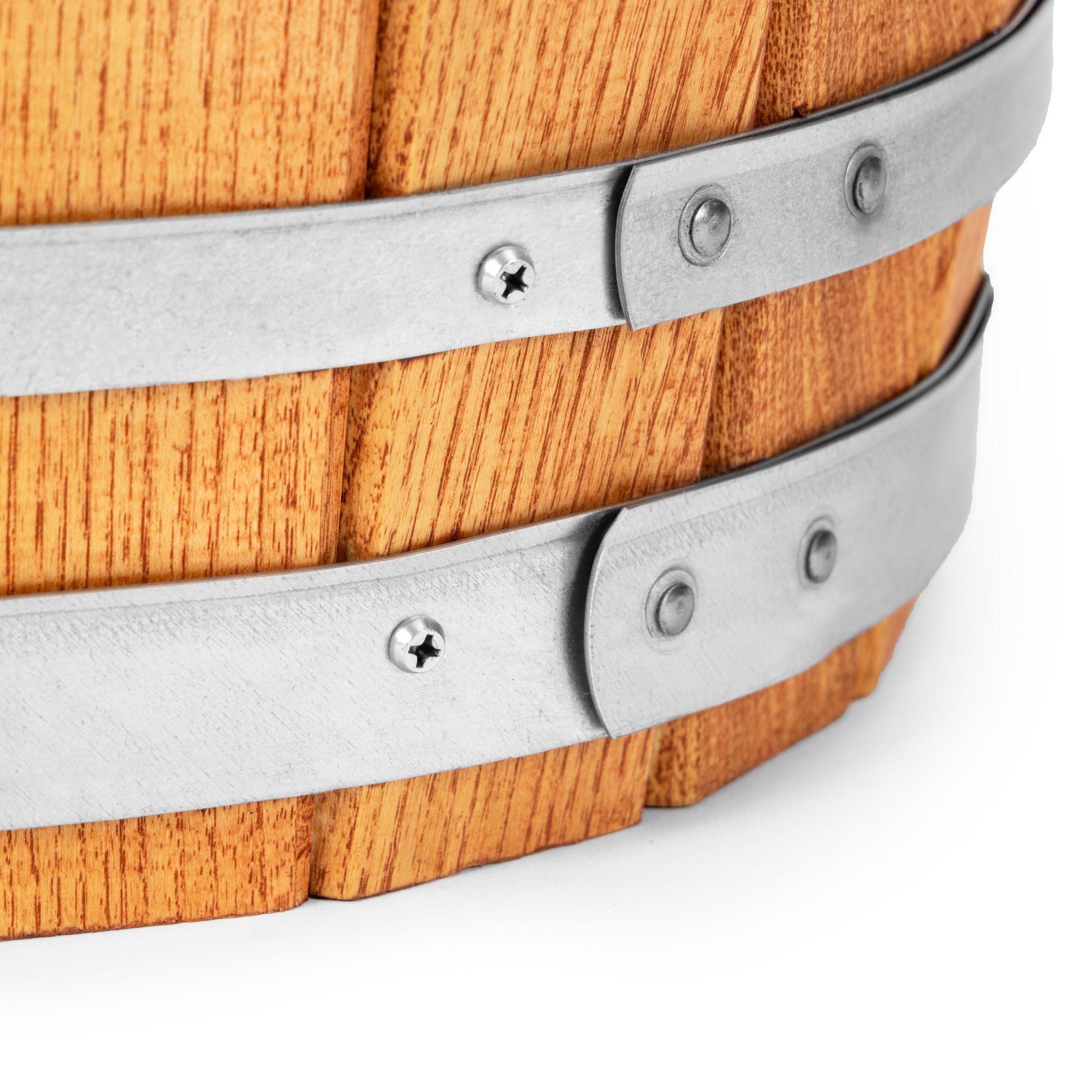 Solidna i stylowa okrągła donica ogrodowa doskonałej jakości wykonana z litego drewna. Kształt beczki nadaje jej klasyczny wygląd, a obręcze zapewniają trwałość i stabilność.