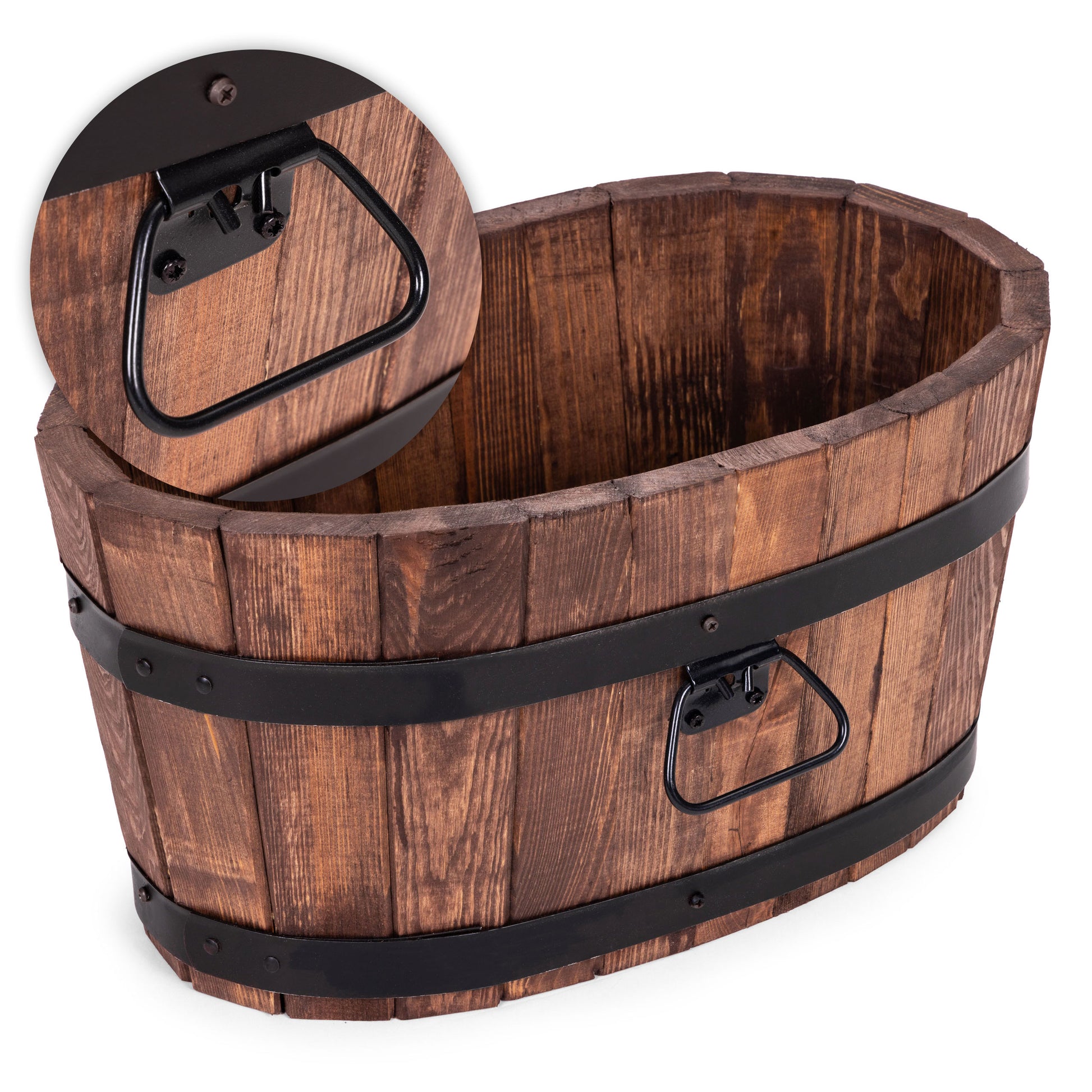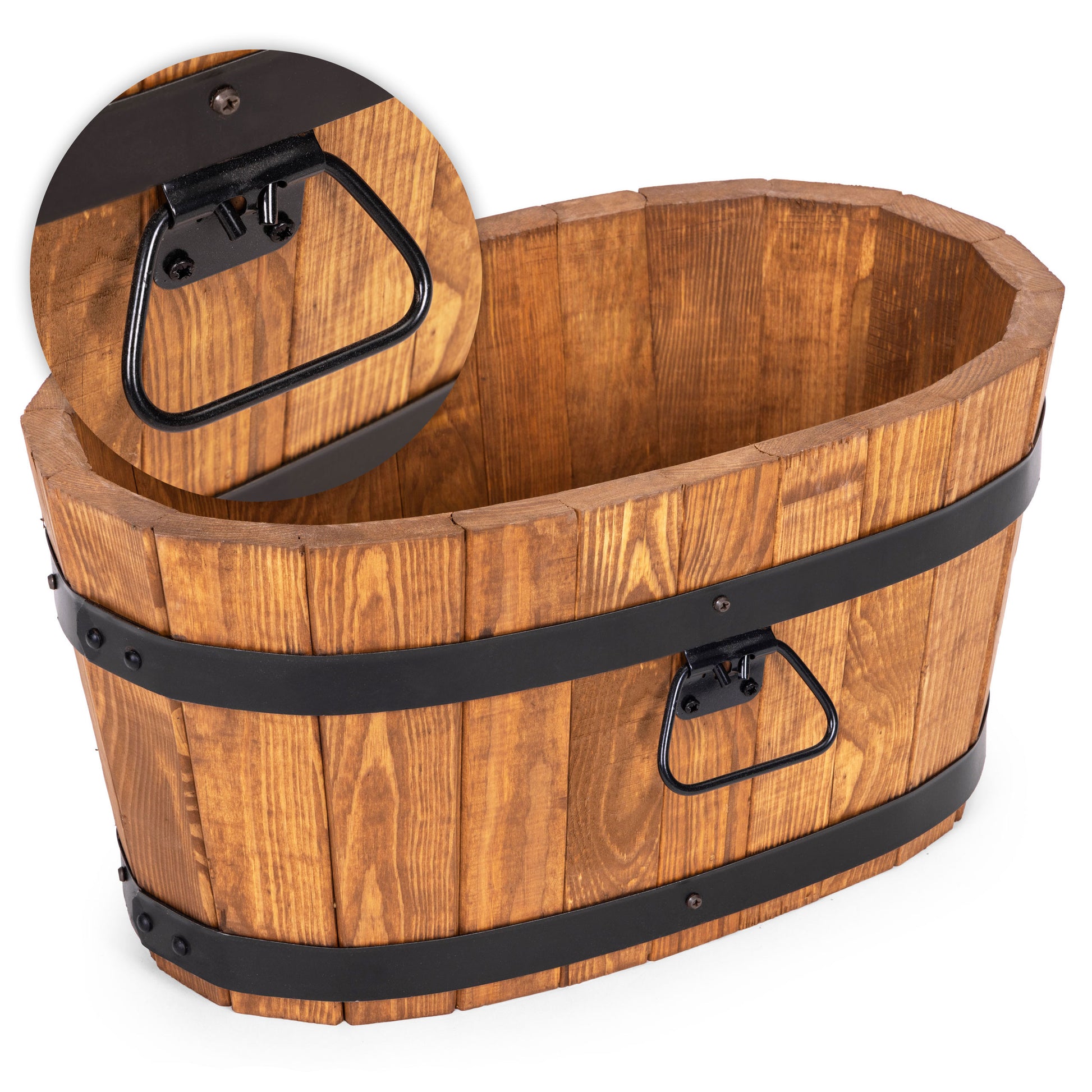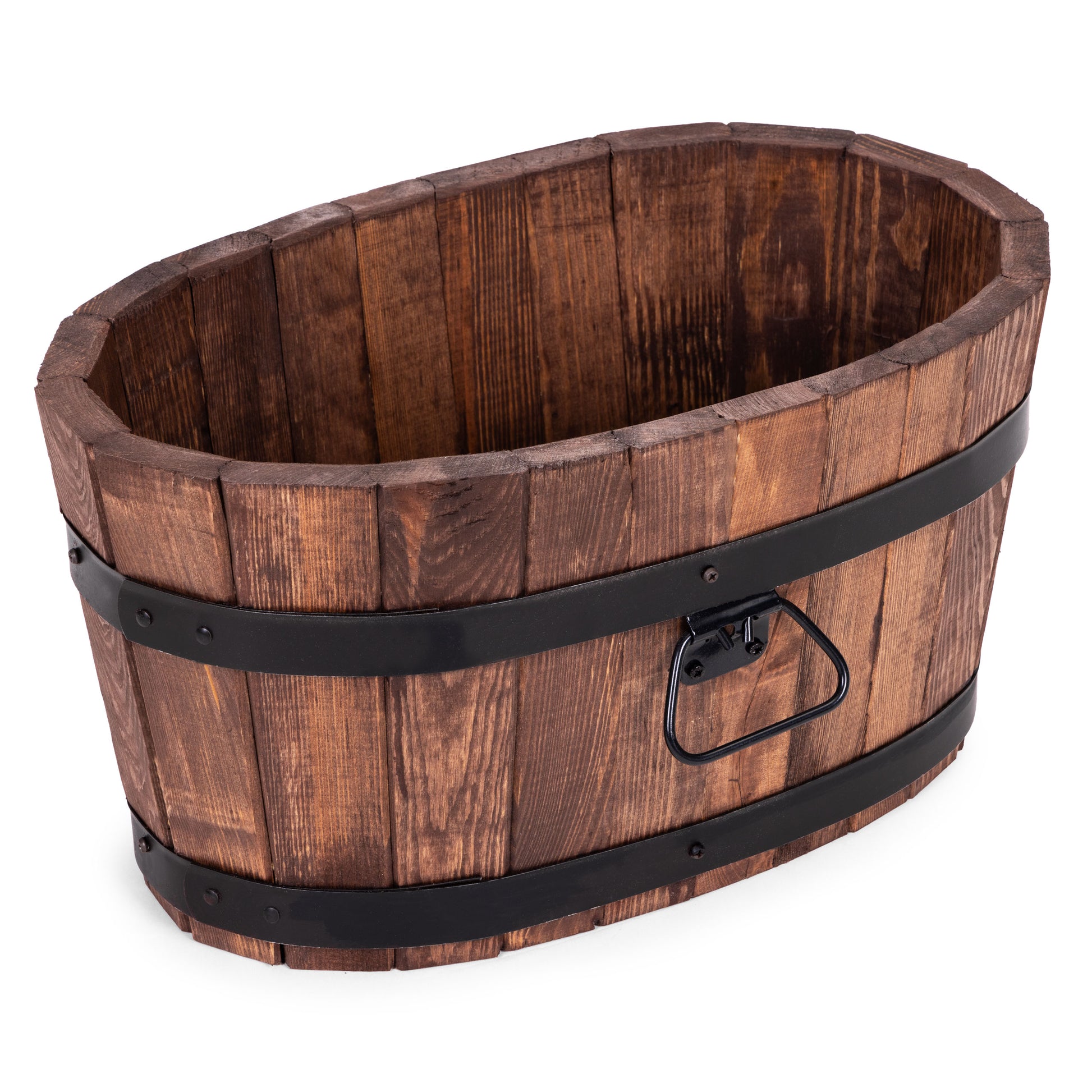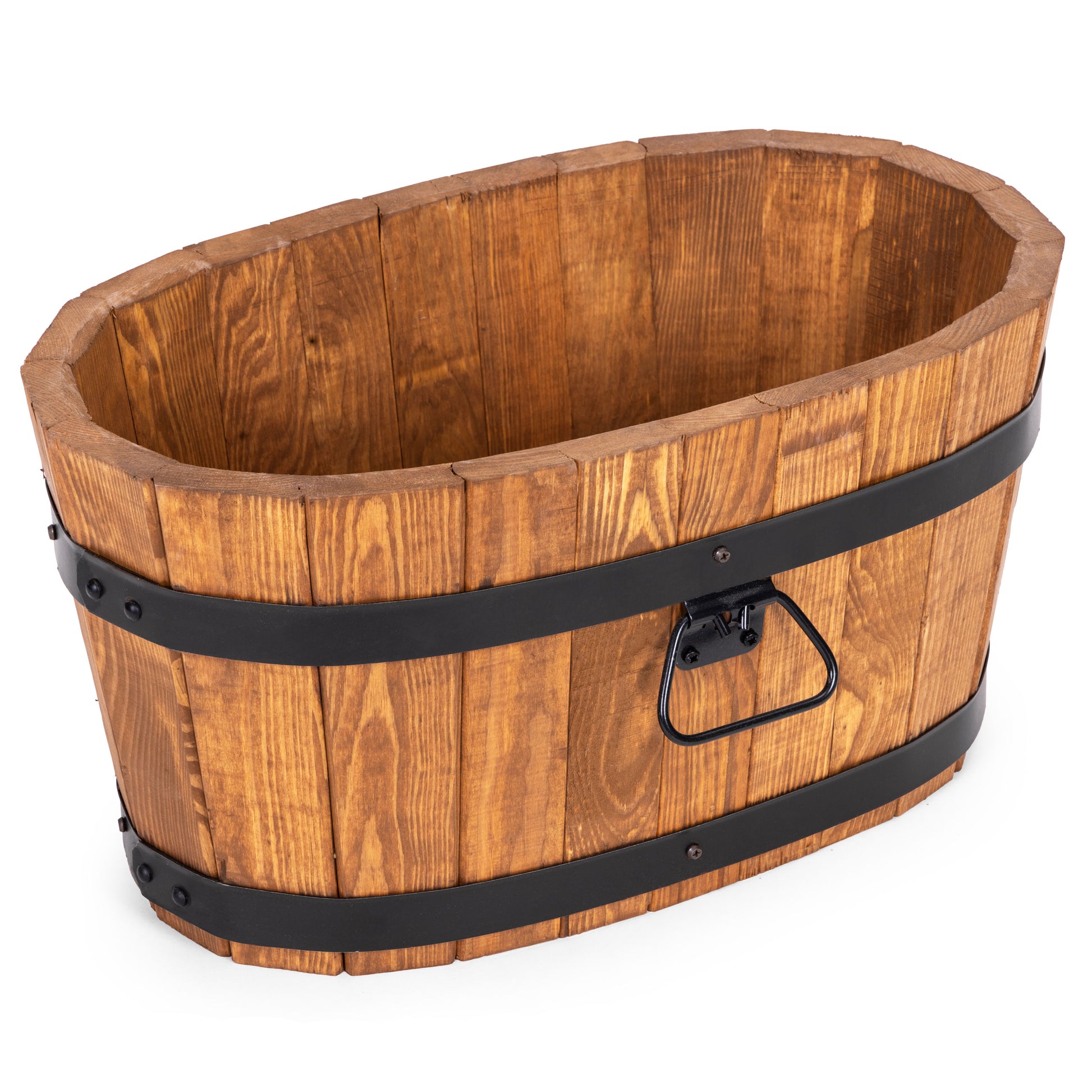 Solidna i stylowa okrągła donica ogrodowa doskonałej jakości wykonana z litego drewna. Kształt beczki nadaje jej klasyczny wygląd, a obręcze zapewniają trwałość i stabilność.
